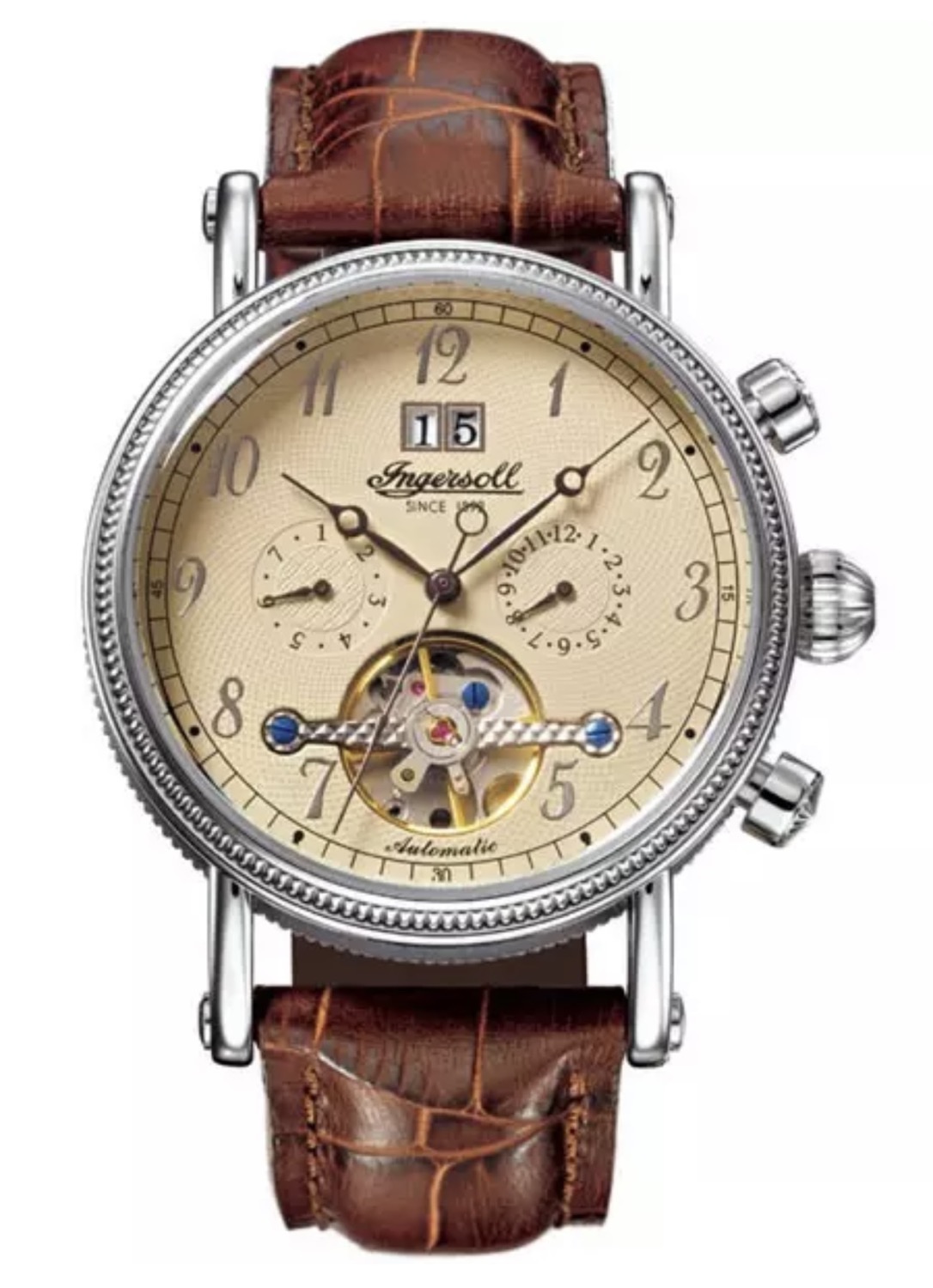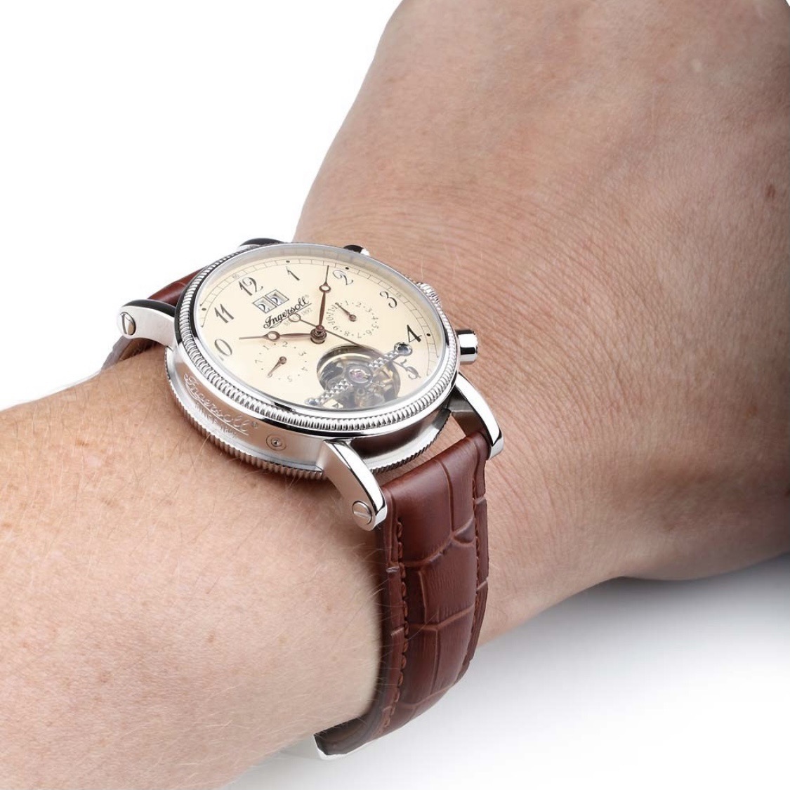 Yellow gold ion-plated stainless steel case with a haymarket fabric leather backed strap. Fixed yellow gold ion-plated bezel. Gold light trench heck dial with gold-tone hands and index hour markers. Minute markers around the outer rim. Dial Type: Analog. Quartz movement. Scratch resistant sapphire crystal. Solid case back. Case dimensions: 20 mm x 26 mm. Rectangle case shape. Band width: 14 mm. Deployment clasp. Water resistant at 30 meters / 100 feet.